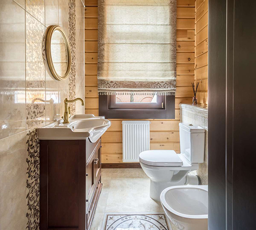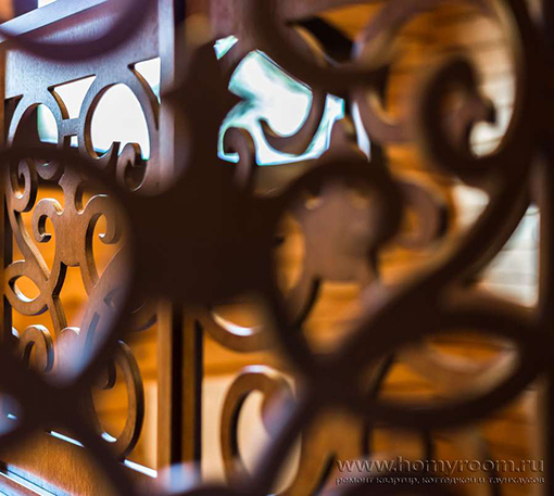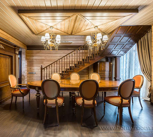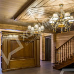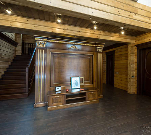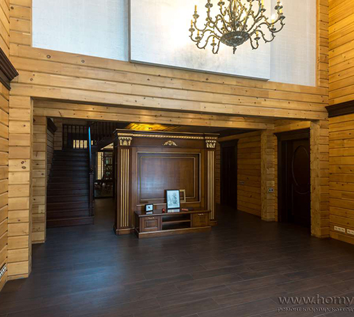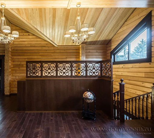 Мы приступили к работе, когда все стены были возведены, включая внутренние перегородки, и смонтирована кровля. Сложность состояла в том, что планировочное решение было согласовано заказчиками на момент заказа коробки деревянного дома. На том этапе был учтен лишь набор помещений и поэтажное размещение. А вот пропорции комнат и их функциональное наполнение не были продуманы. Используя визуальные приемы, нам удалось скорректировать пропорции помещений и сделать жилье более уютными и функциональными.