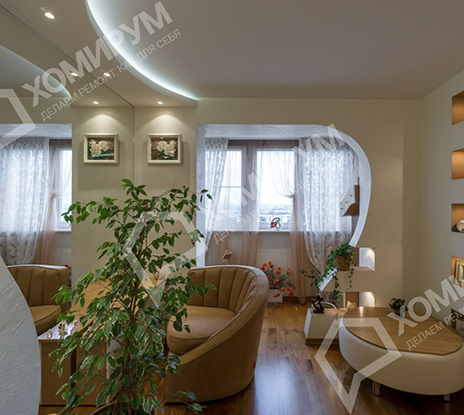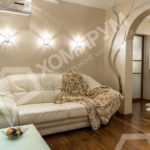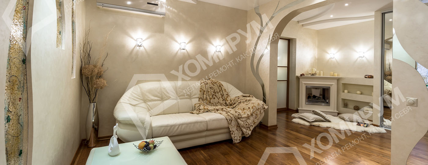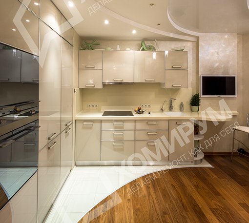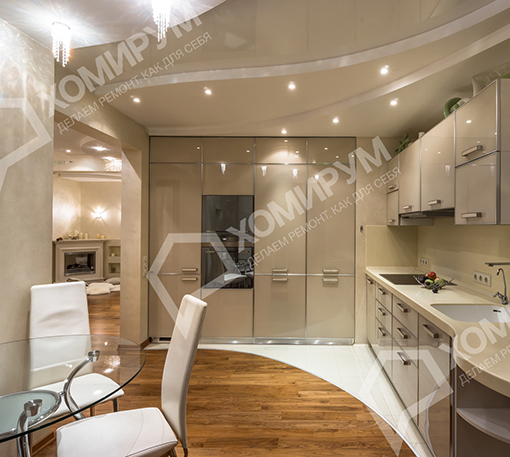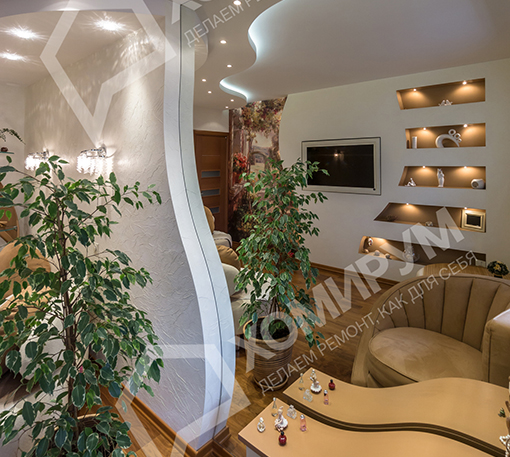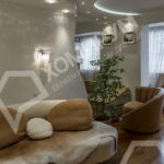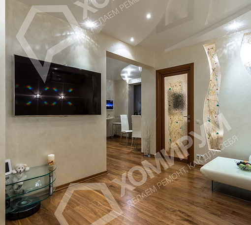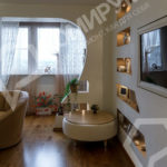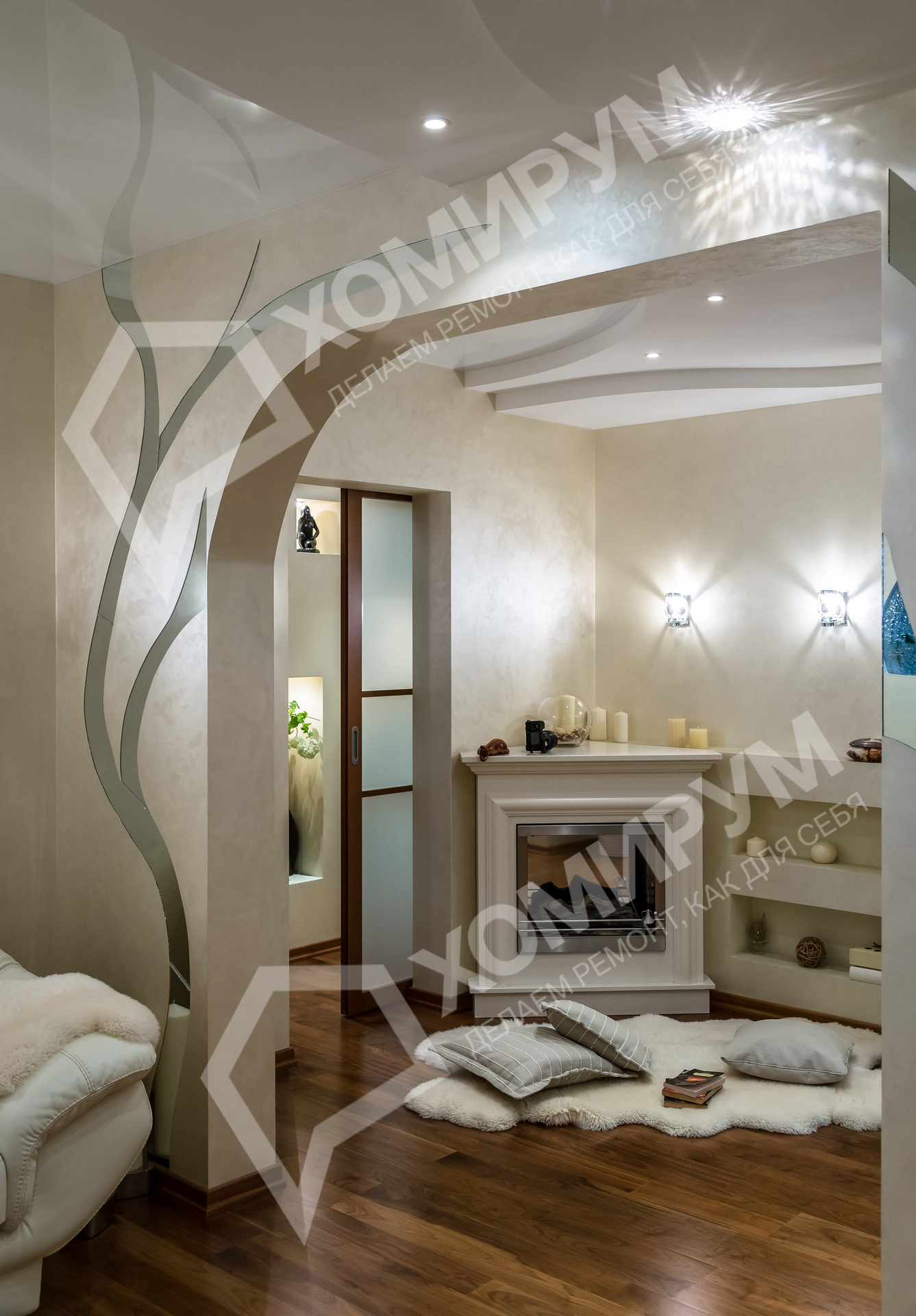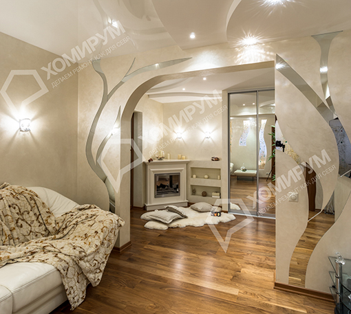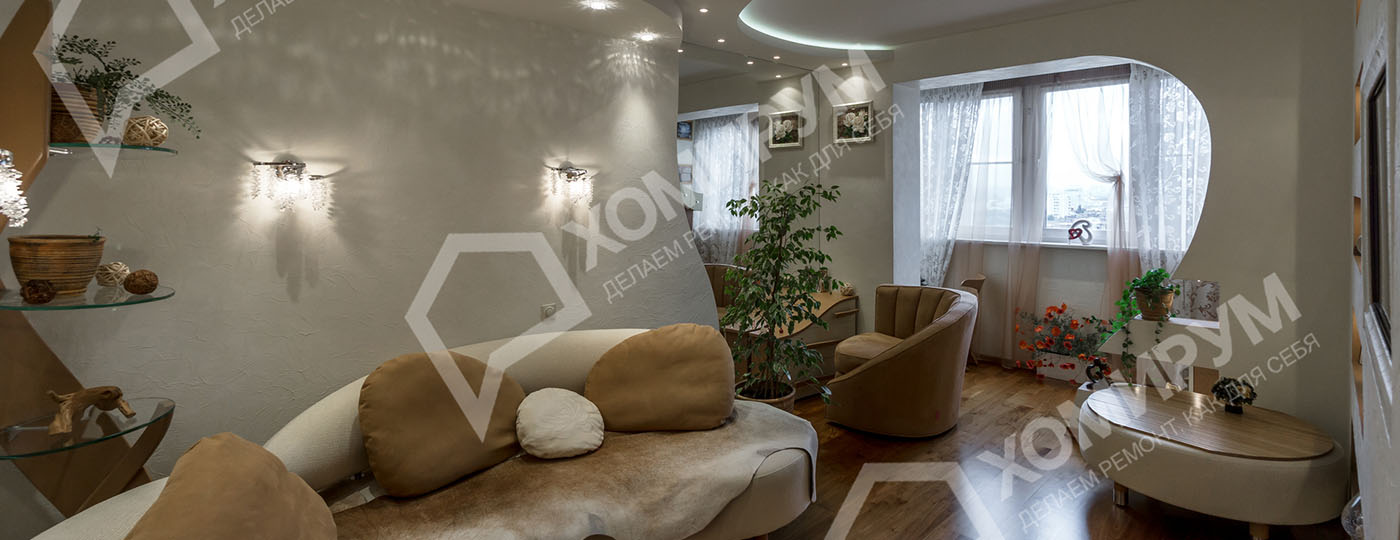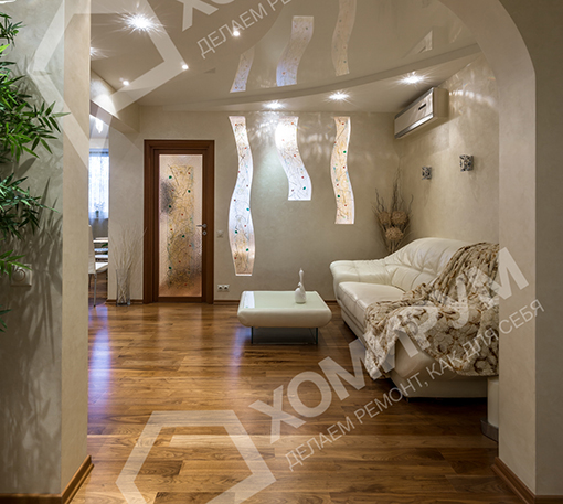 Грамотная перепланировка квартиры и применение дизайнерских приемов (использование зеркальных вставок и витражных стекол, потолочные радиусные линии, перетекающие из комнаты в комнату и др.) позволили нам значительно увеличить объем квартиры, создав единый стиль проектируемого помещения.