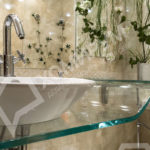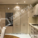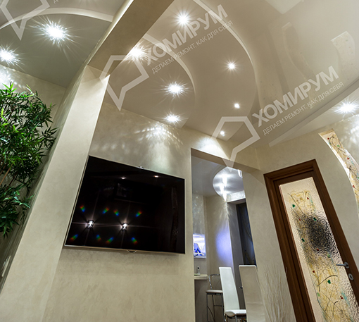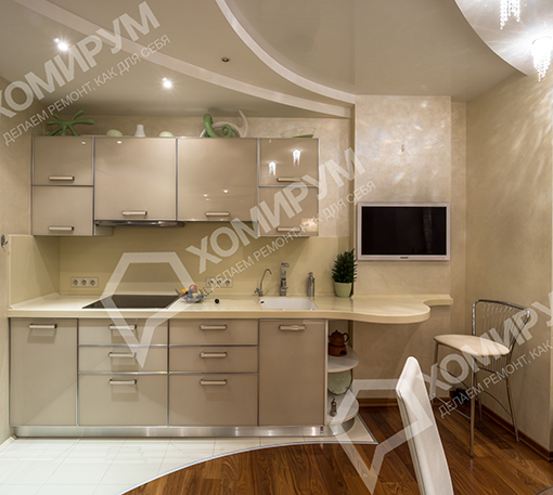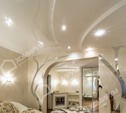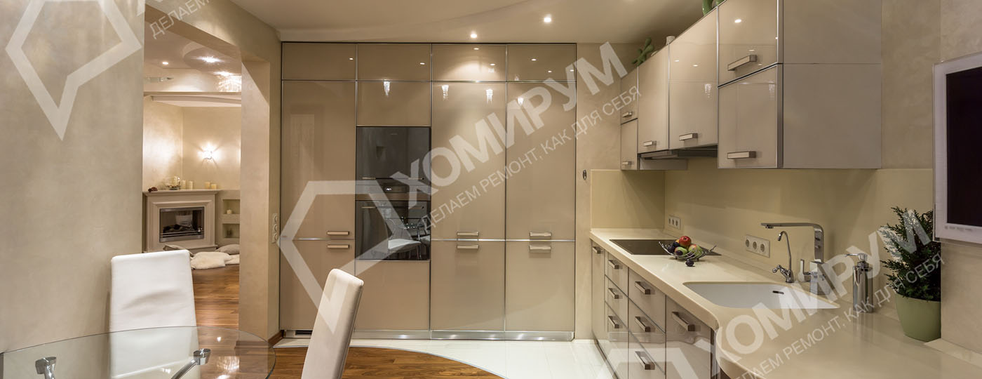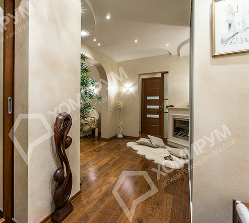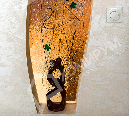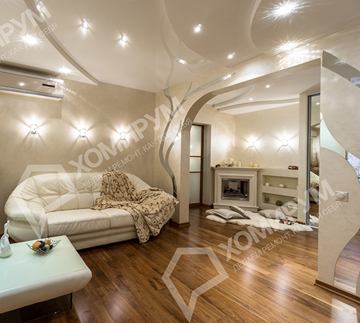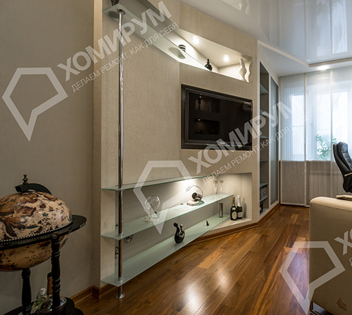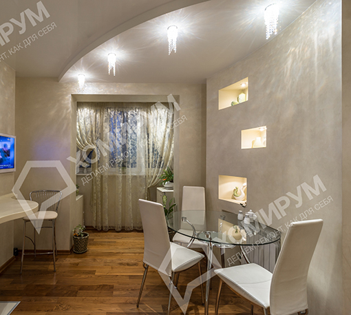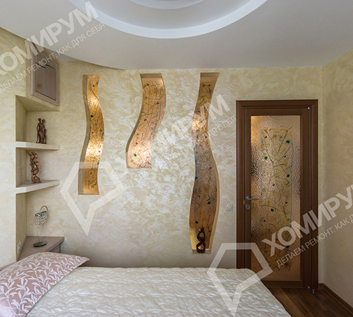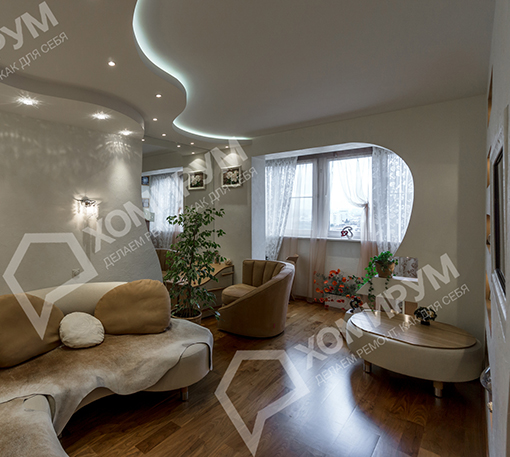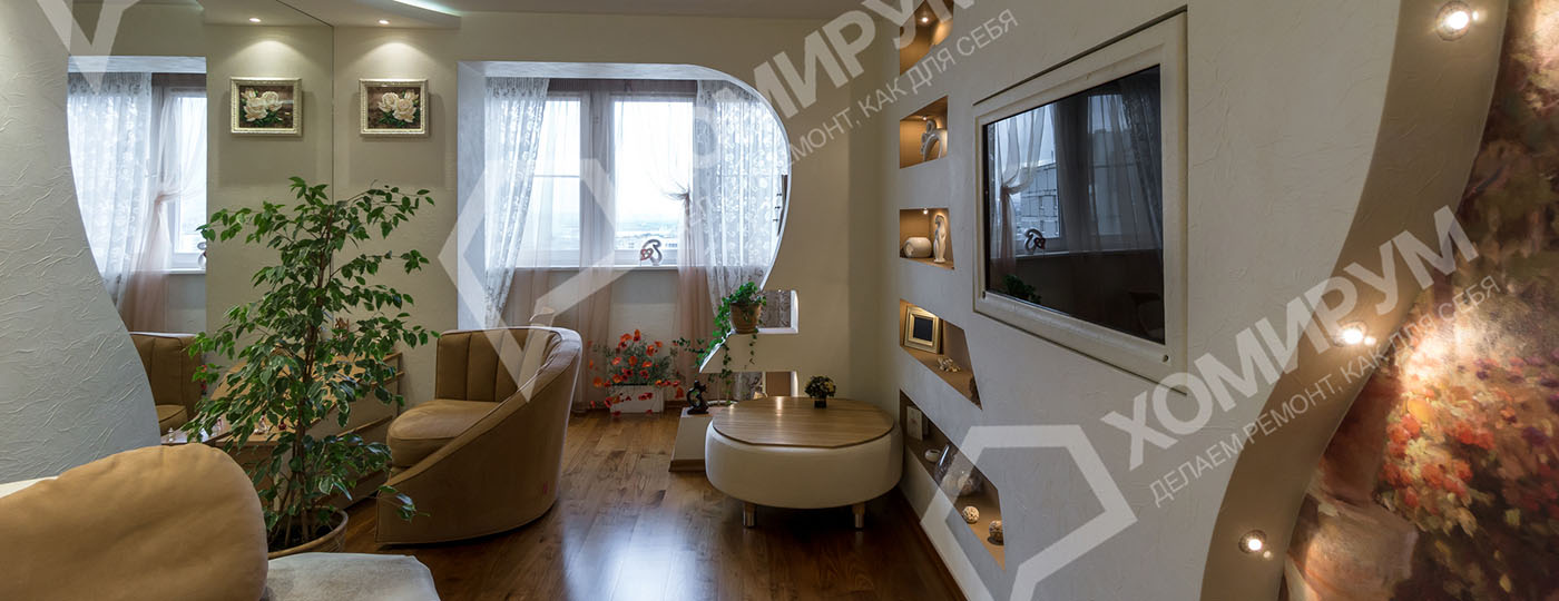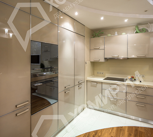 Грамотная перепланировка квартиры и применение дизайнерских приемов (использование зеркальных вставок и витражных стекол, потолочные радиусные линии, перетекающие из комнаты в комнату и др.) позволили нам значительно увеличить объем квартиры, создав единый стиль проектируемого помещения.