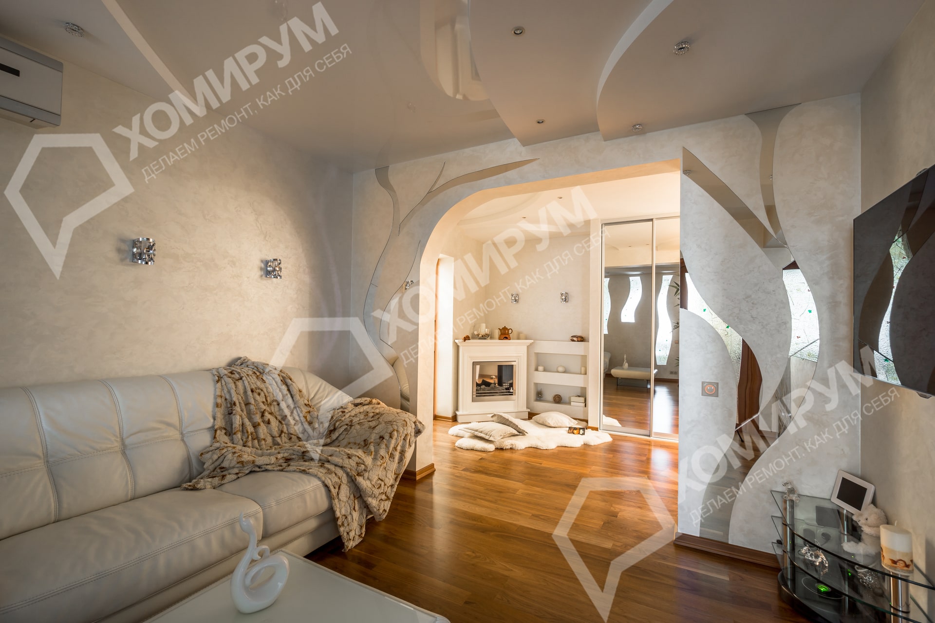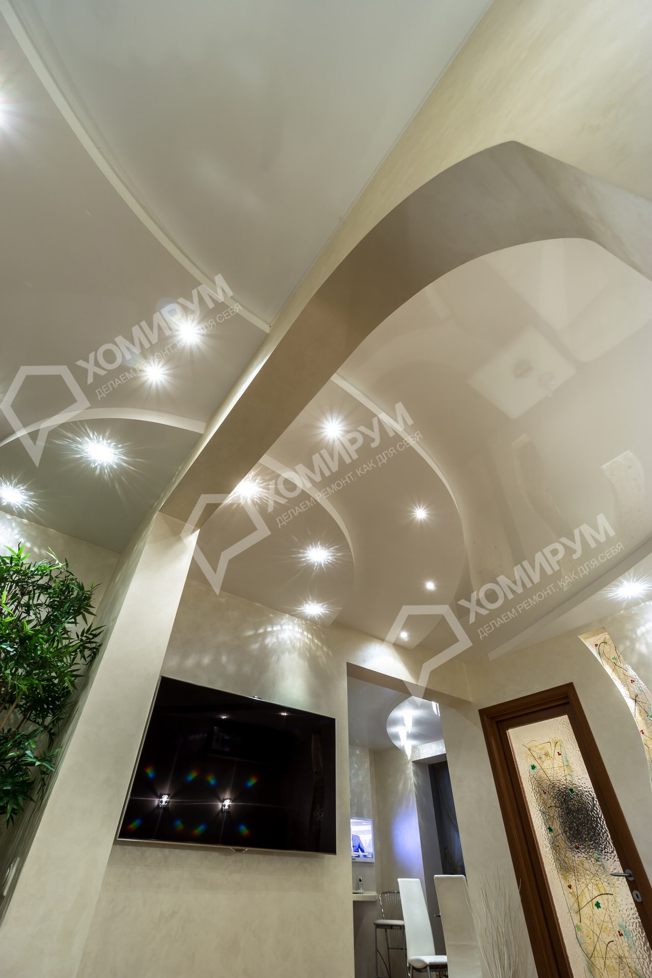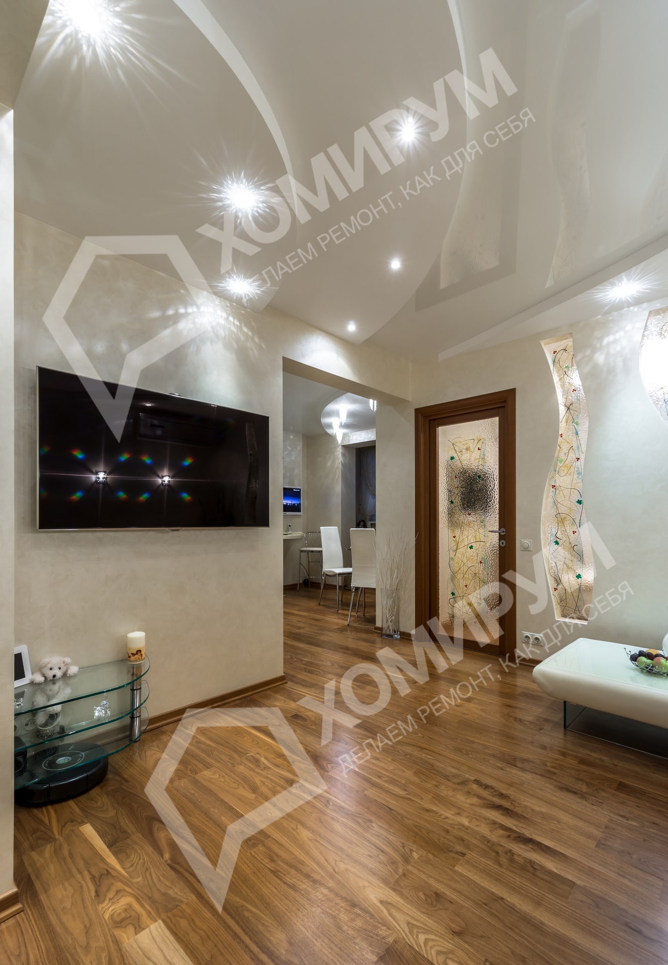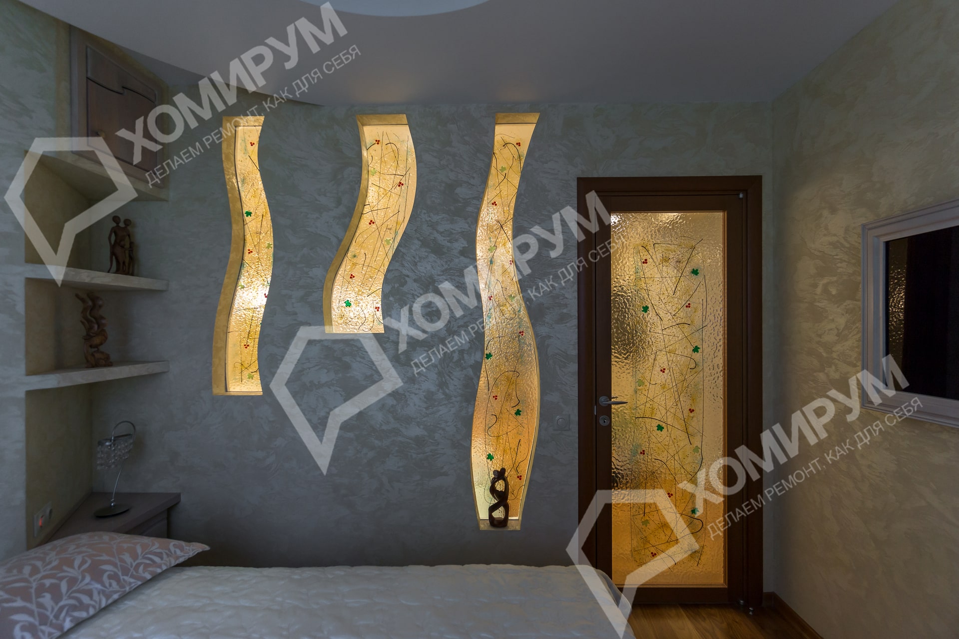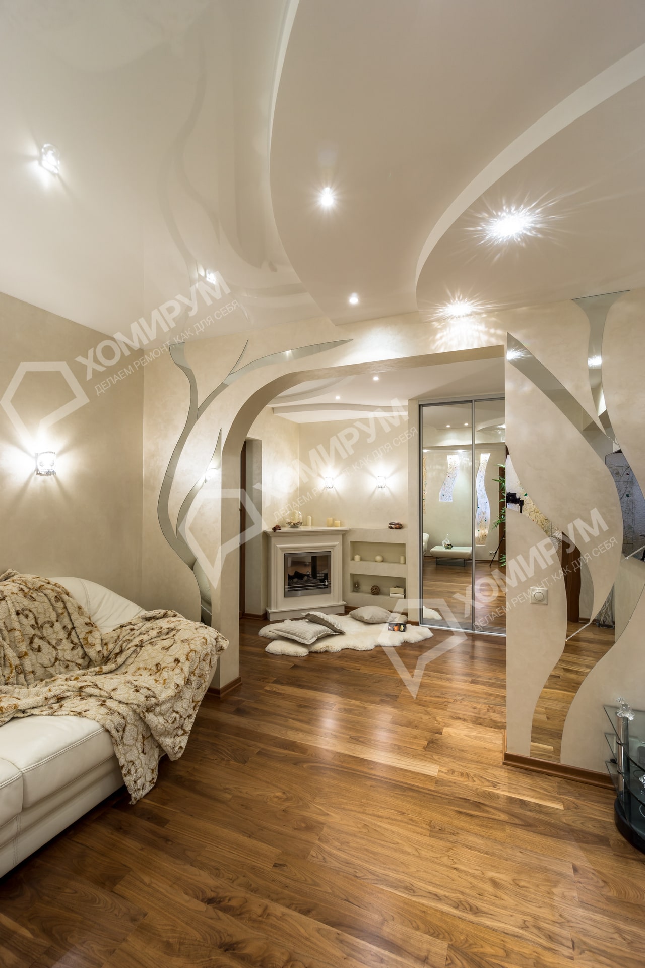 Грамотная перепланировка квартиры и применение дизайнерских приемов (использование зеркальных вставок и витражных стекол, потолочные радиусные линии, перетекающие из комнаты в комнату и др.) позволили нам значительно увеличить объем квартиры, создав единый стиль проектируемого помещения.