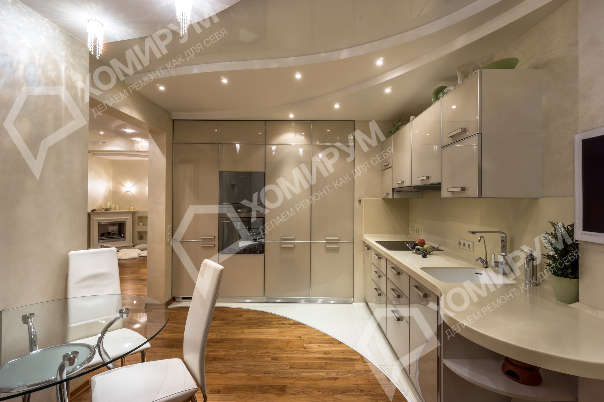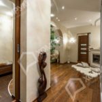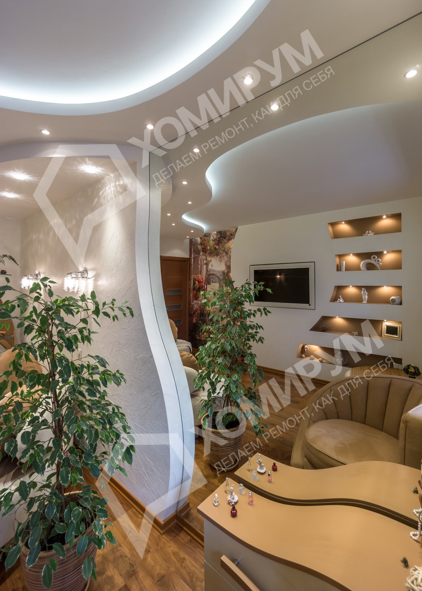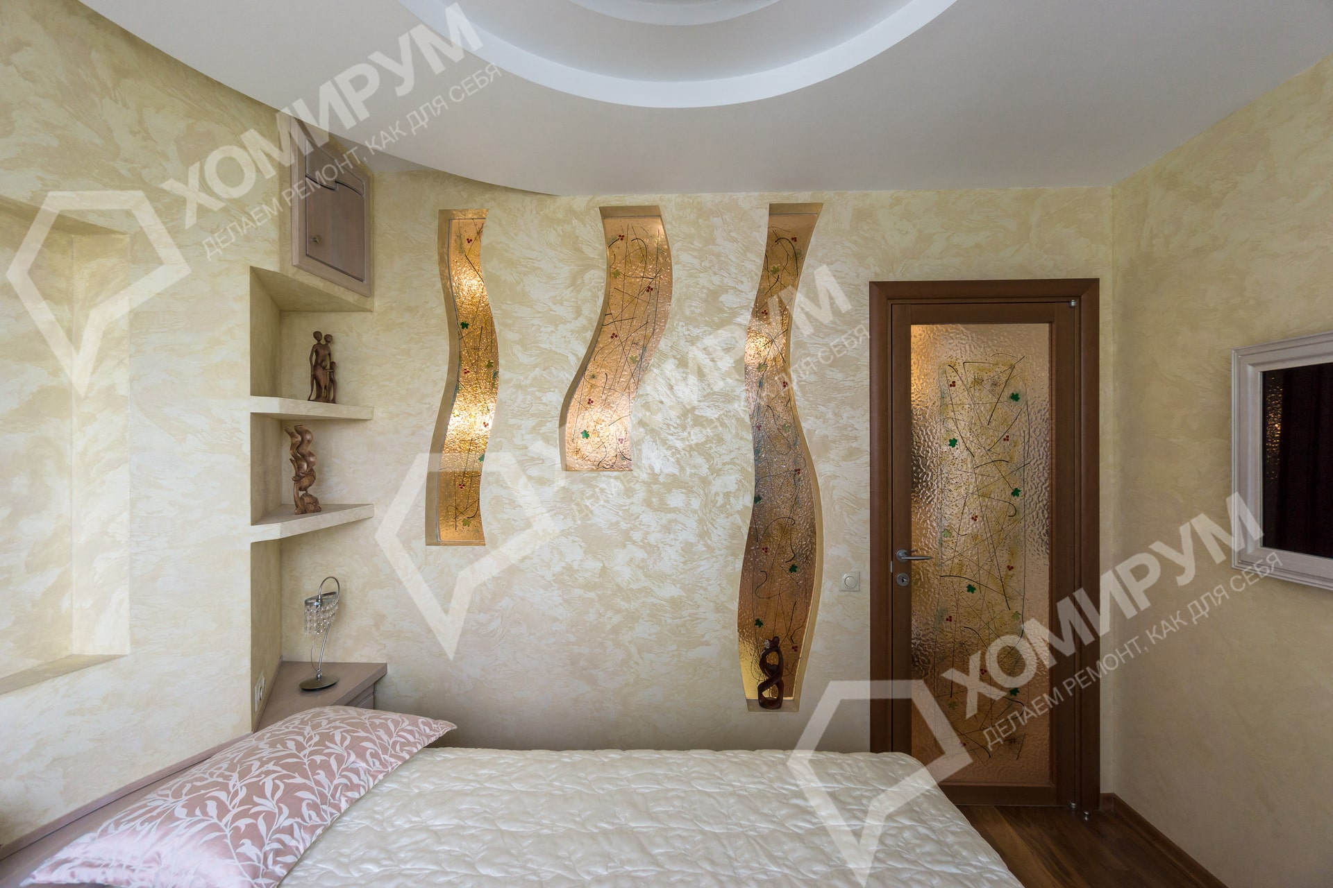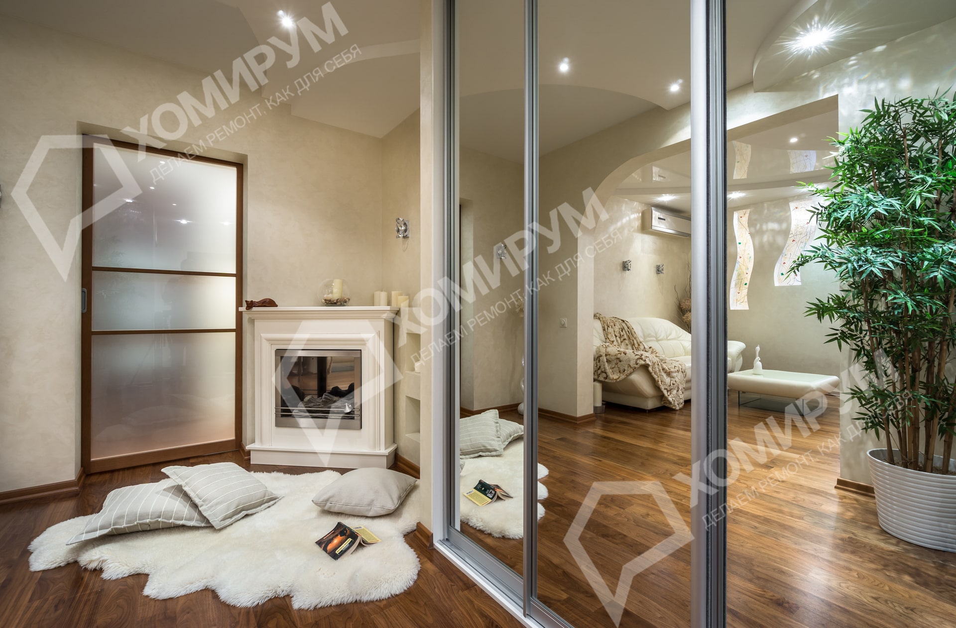 Грамотная перепланировка квартиры и применение дизайнерских приемов (использование зеркальных вставок и витражных стекол, потолочные радиусные линии, перетекающие из комнаты в комнату и др.) позволили нам значительно увеличить объем квартиры, создав единый стиль проектируемого помещения.