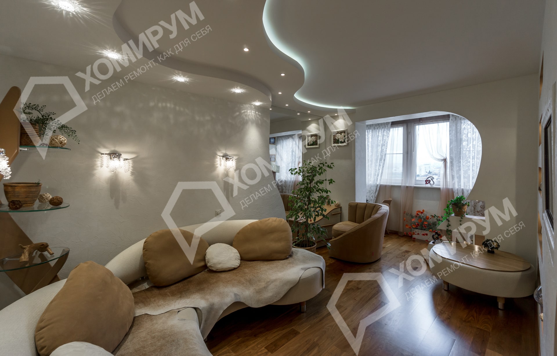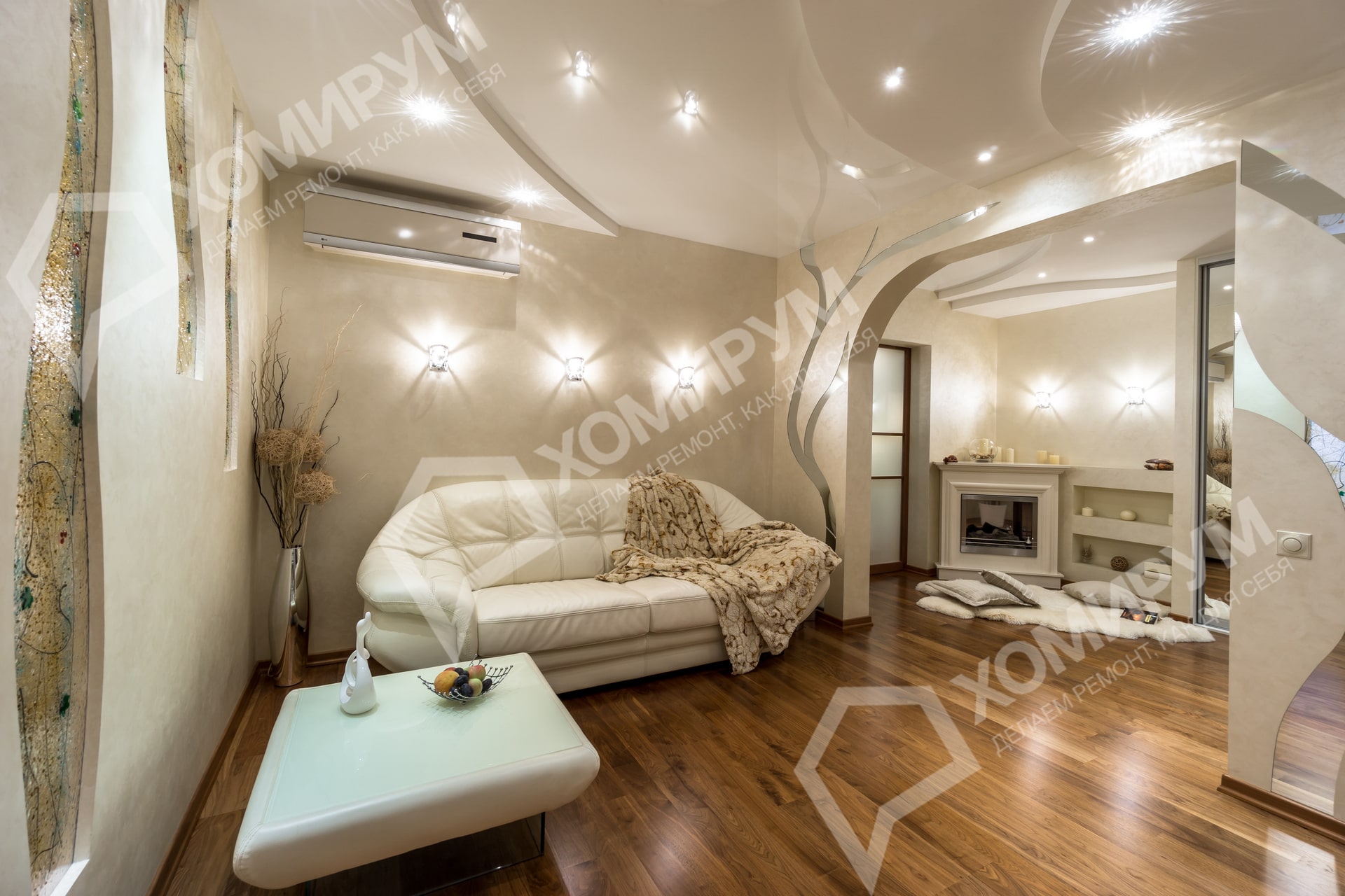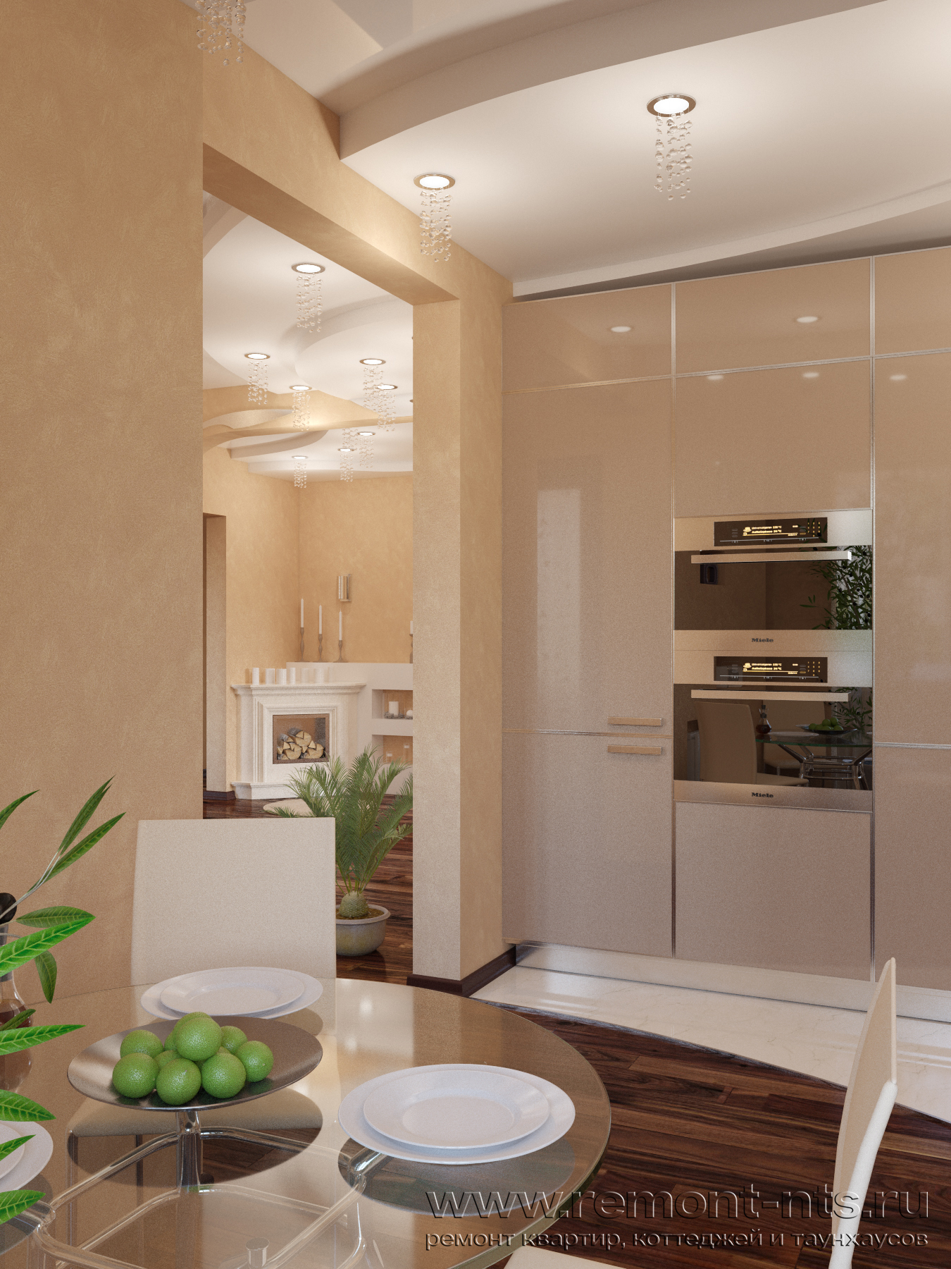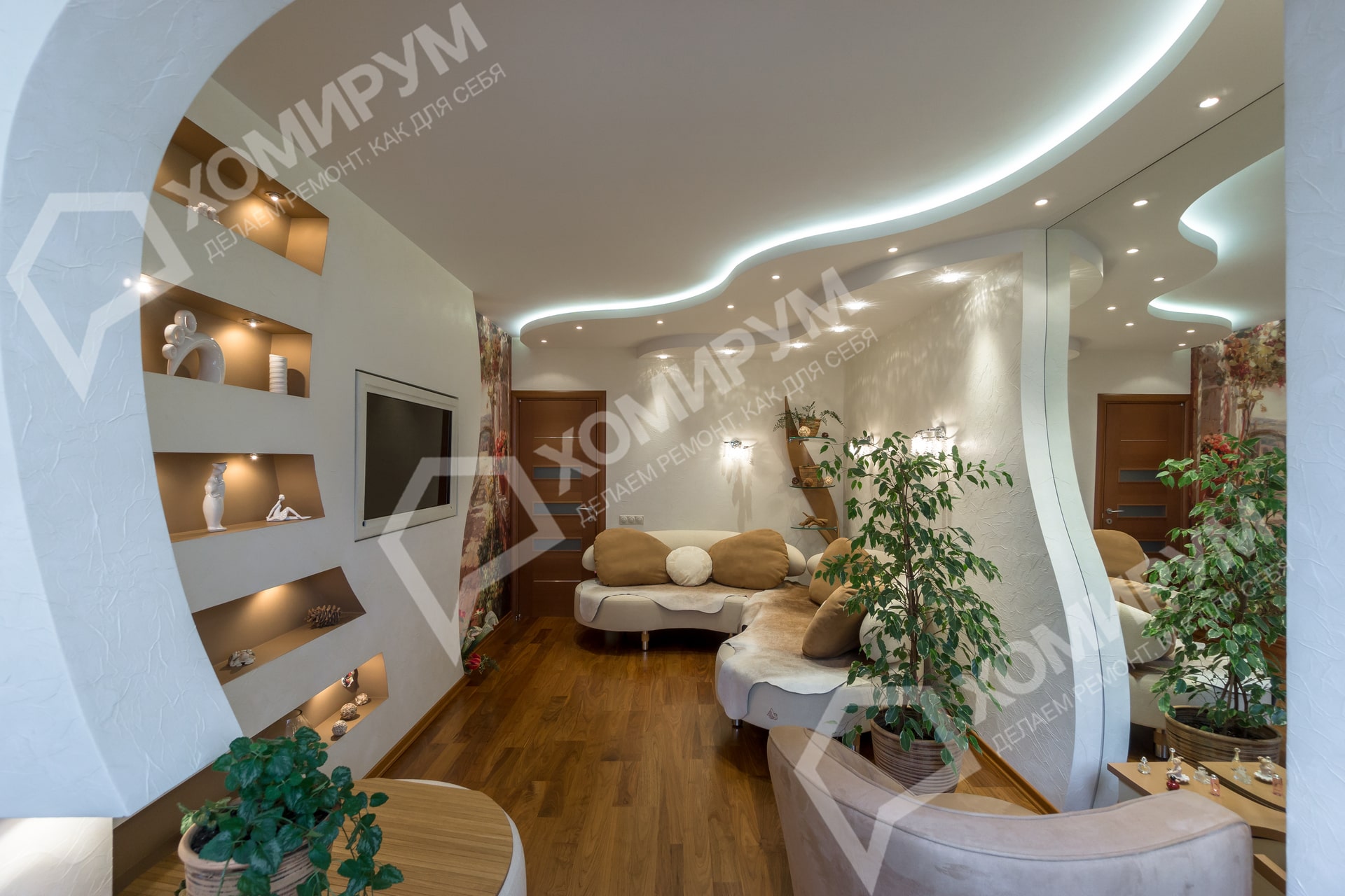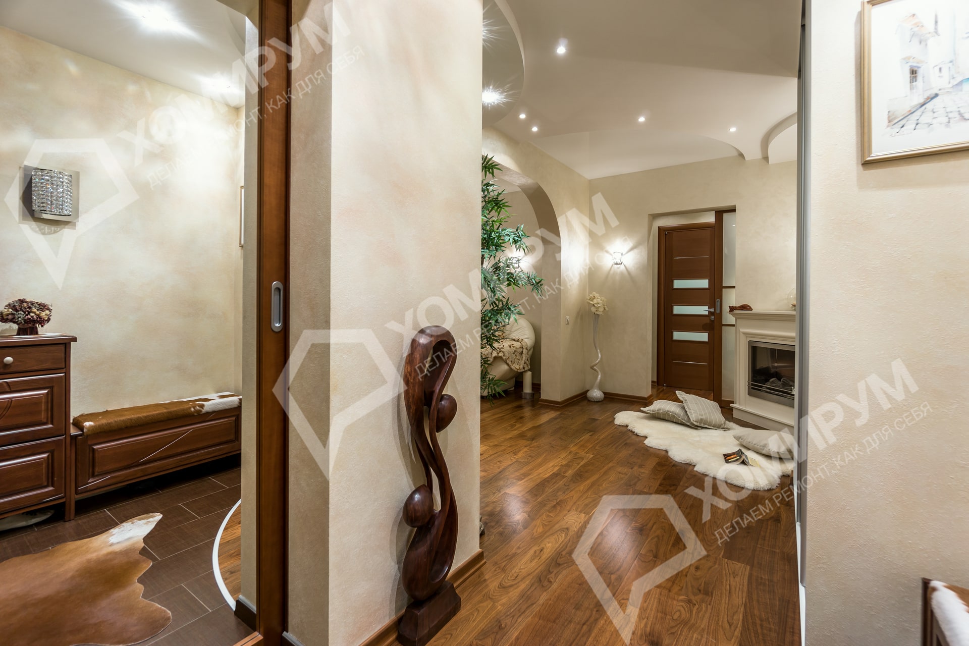 Грамотная перепланировка квартиры и применение дизайнерских приемов (использование зеркальных вставок и витражных стекол, потолочные радиусные линии, перетекающие из комнаты в комнату и др.) позволили нам значительно увеличить объем квартиры, создав единый стиль проектируемого помещения.