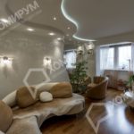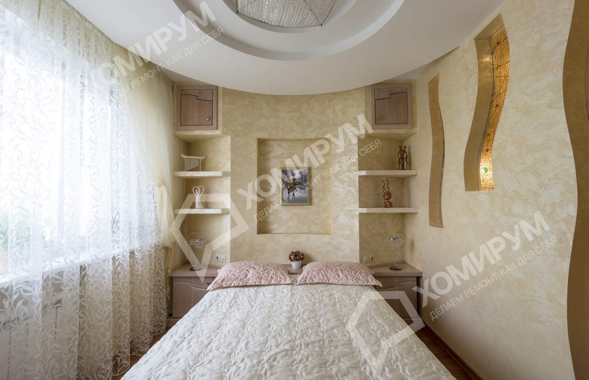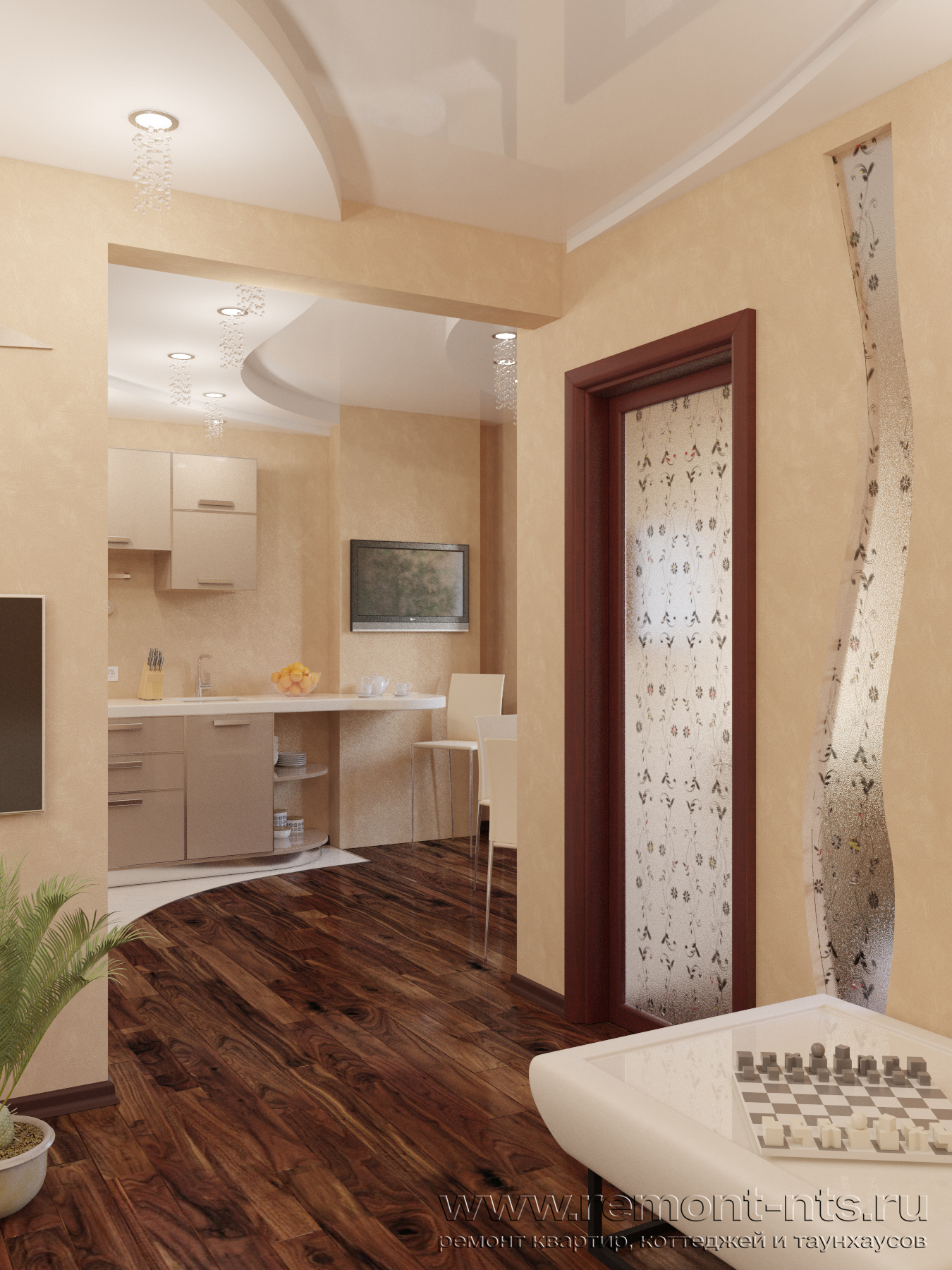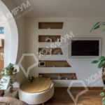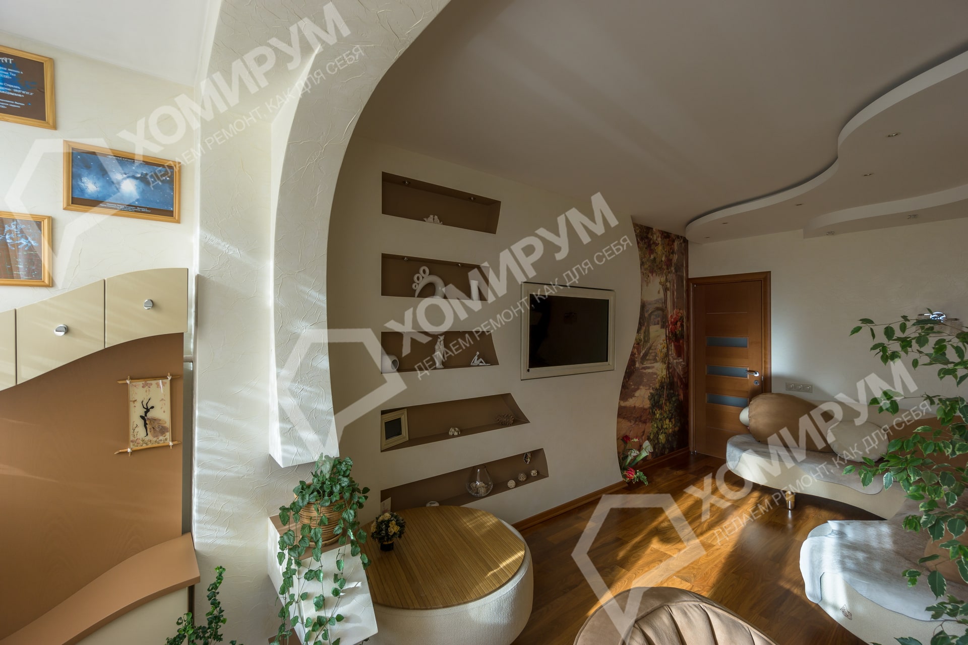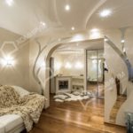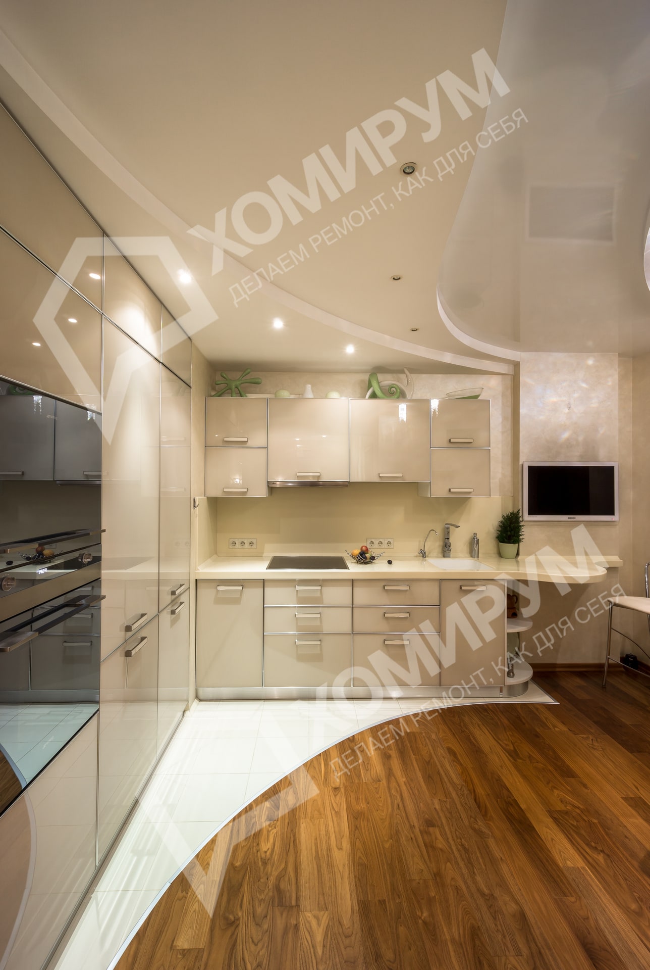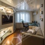 Грамотная перепланировка квартиры и применение дизайнерских приемов (использование зеркальных вставок и витражных стекол, потолочные радиусные линии, перетекающие из комнаты в комнату и др.) позволили нам значительно увеличить объем квартиры, создав единый стиль проектируемого помещения.