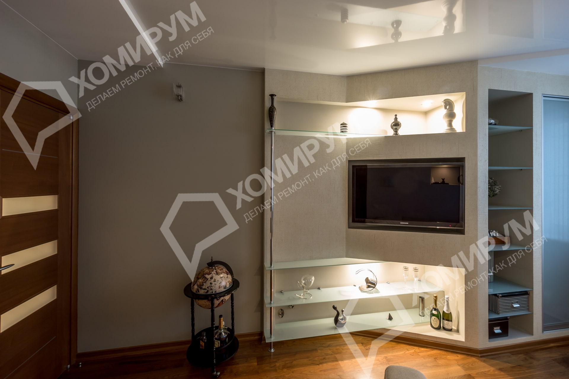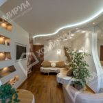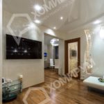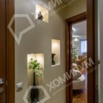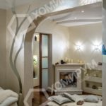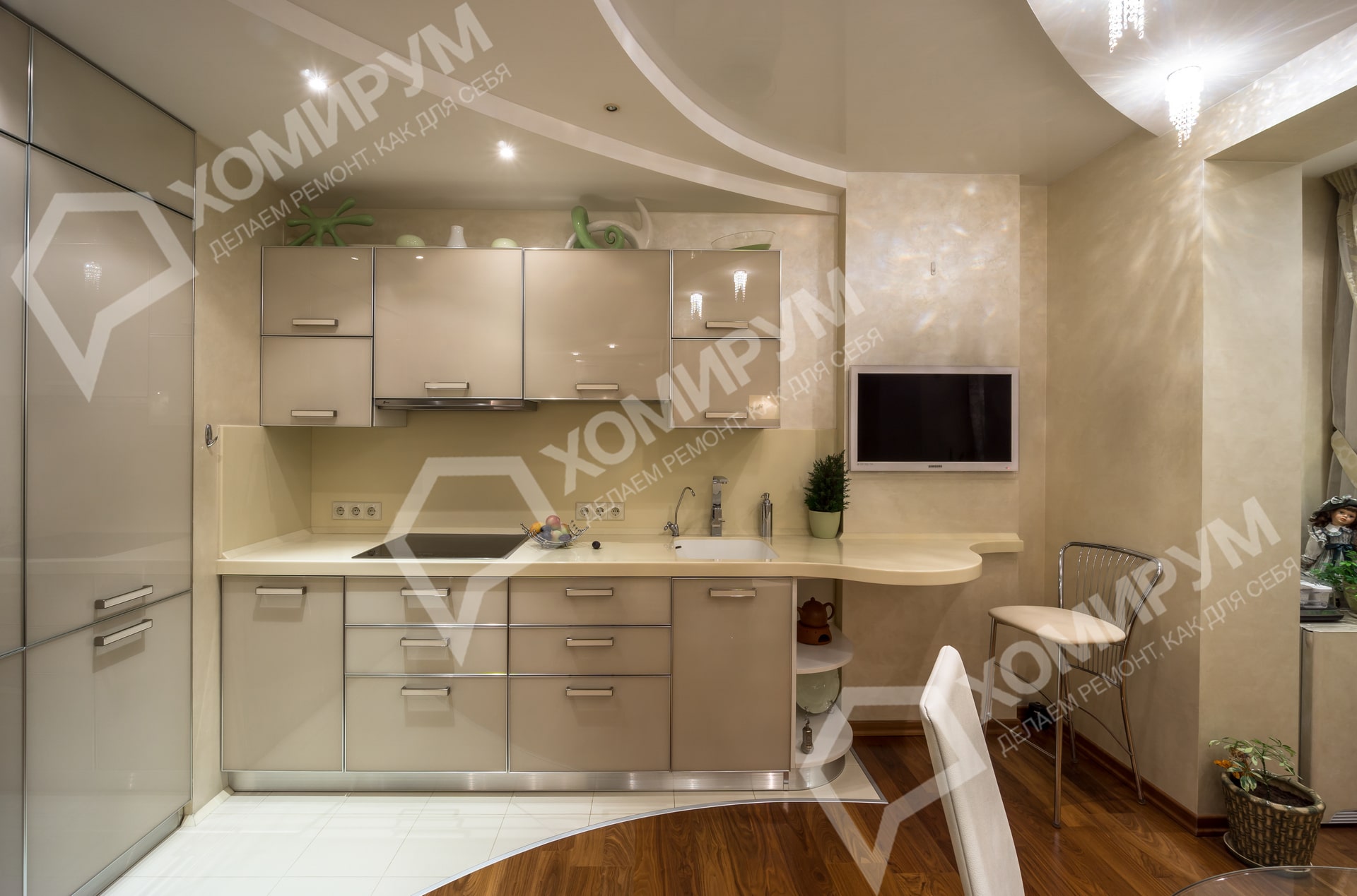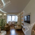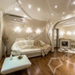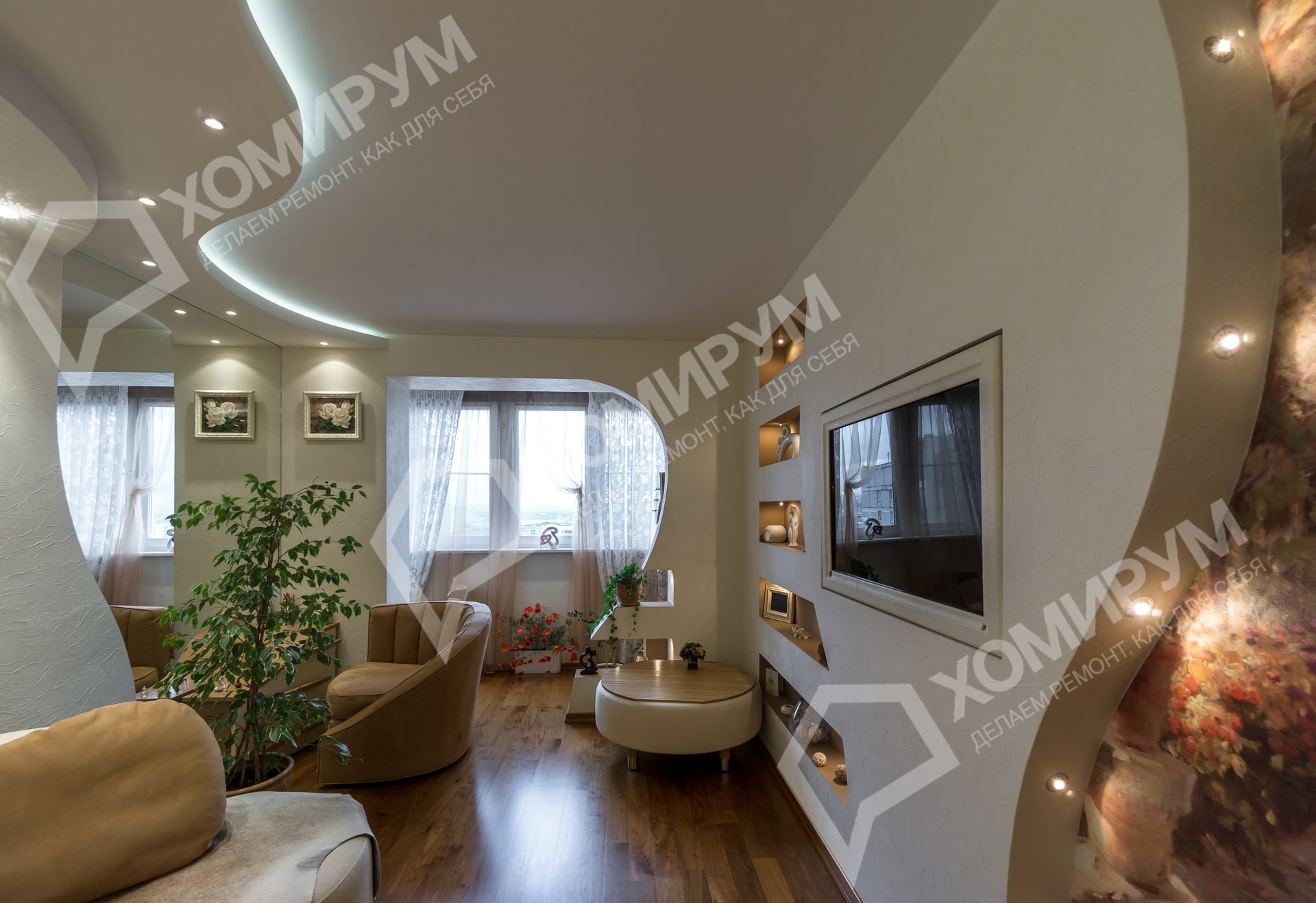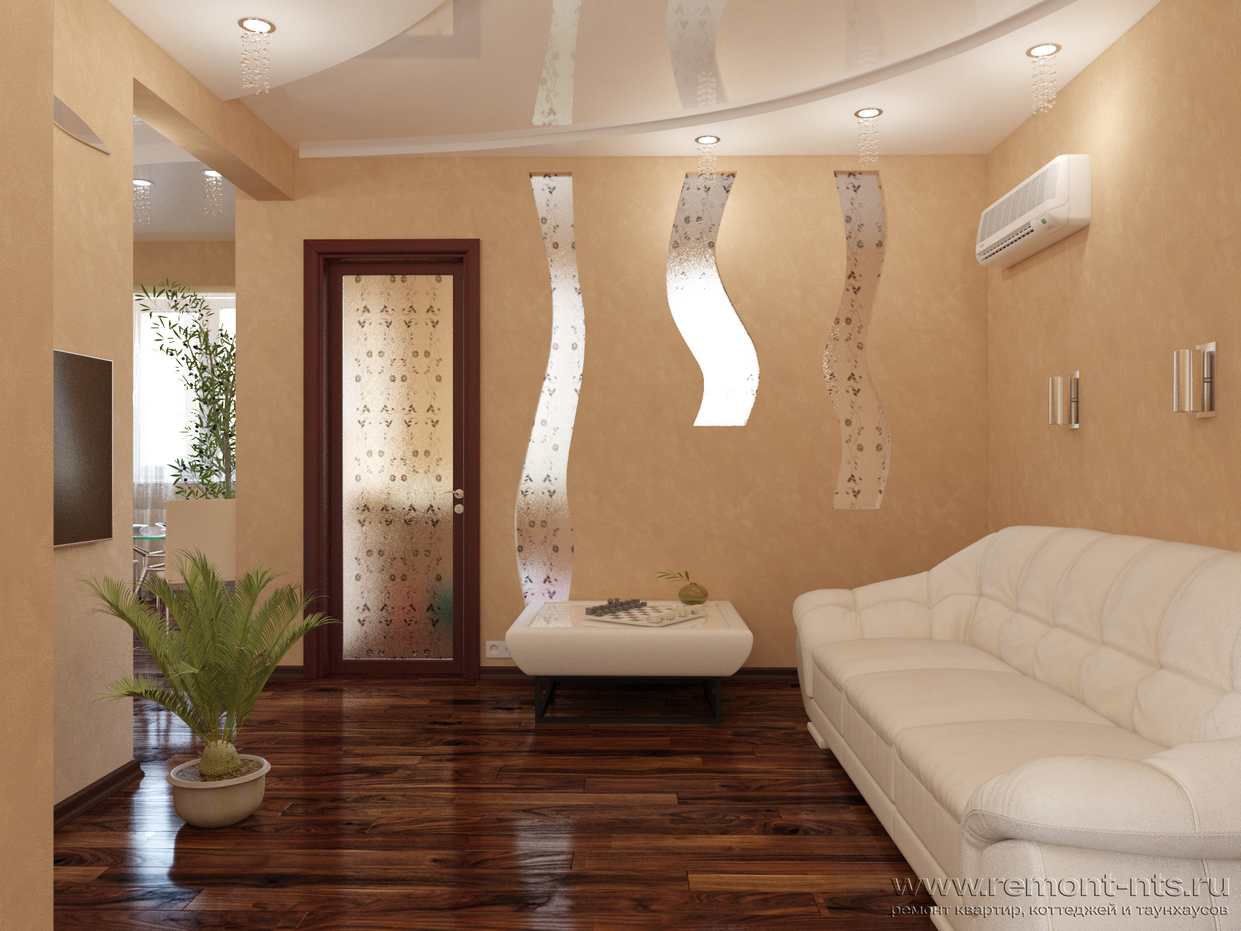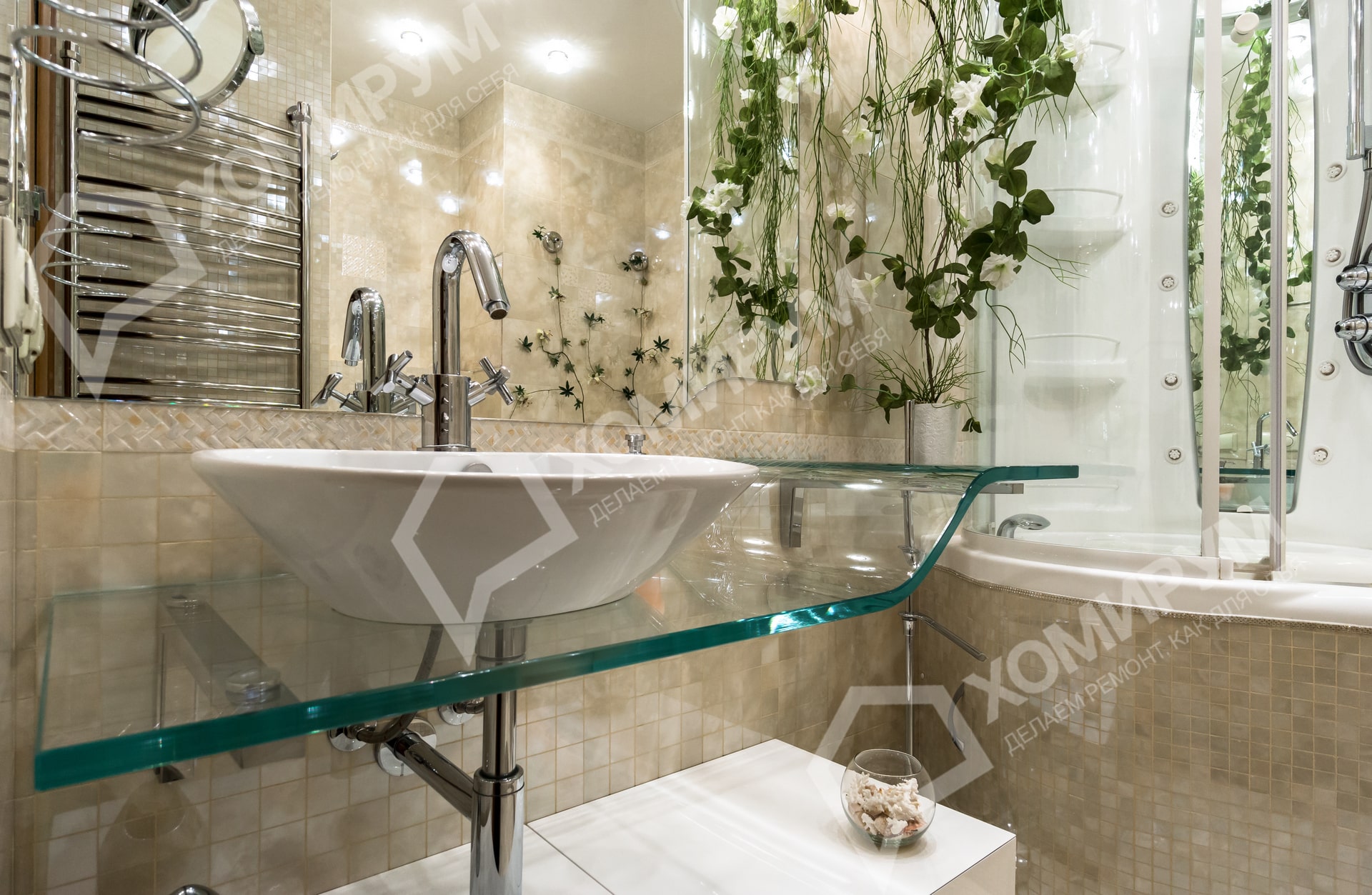 Грамотная перепланировка квартиры и применение дизайнерских приемов (использование зеркальных вставок и витражных стекол, потолочные радиусные линии, перетекающие из комнаты в комнату и др.) позволили нам значительно увеличить объем квартиры, создав единый стиль проектируемого помещения.